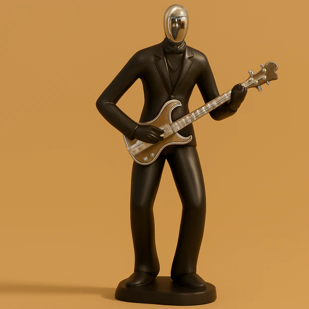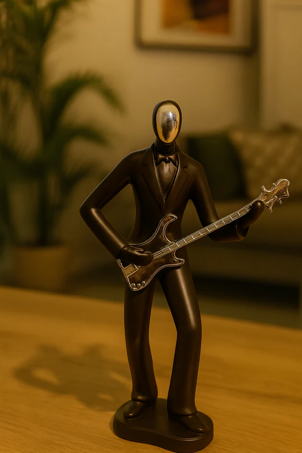 HOME DECOR Elegant Black Guitarist Figurine | Modern Musician Statue with Chrome Face & Guitar | Artistic Home Décor Sculpture for Living Room, Office, Café, Studio | Perfect Music Lover Gift
