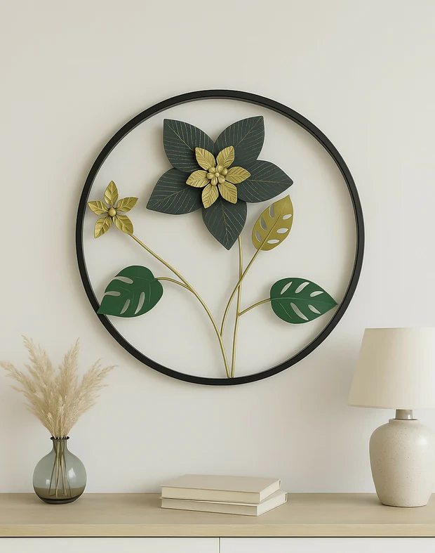 HOME DECOR Black Frame Wall Hanging with Green & Gold Flowers and Leaves