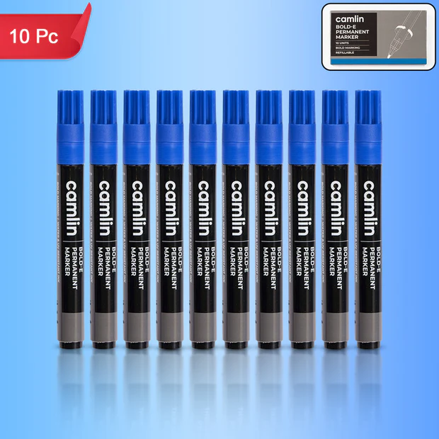 Camlin Bold-E Permanent Marker Blue Long-Lasting Refillable Marker Pack 10
