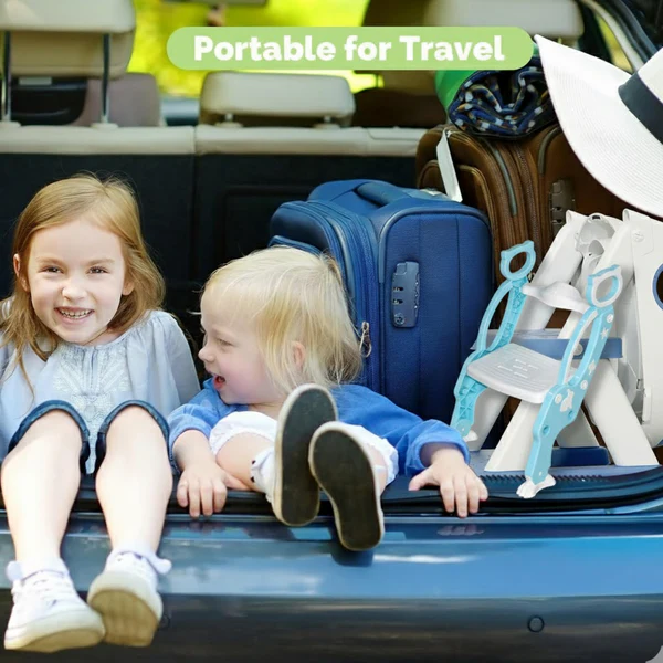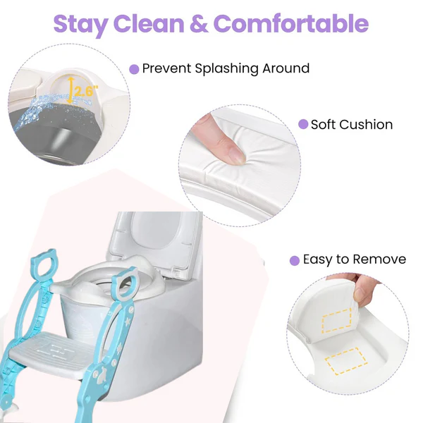The potty training seat with step stool ladder aims to encourage kids(boys or girls) to go to the toilet independently, NOT delay on diapers or their parents. The ergonomic design with unique double handrail & non-slip foot pads offers great comfort and safe for children.