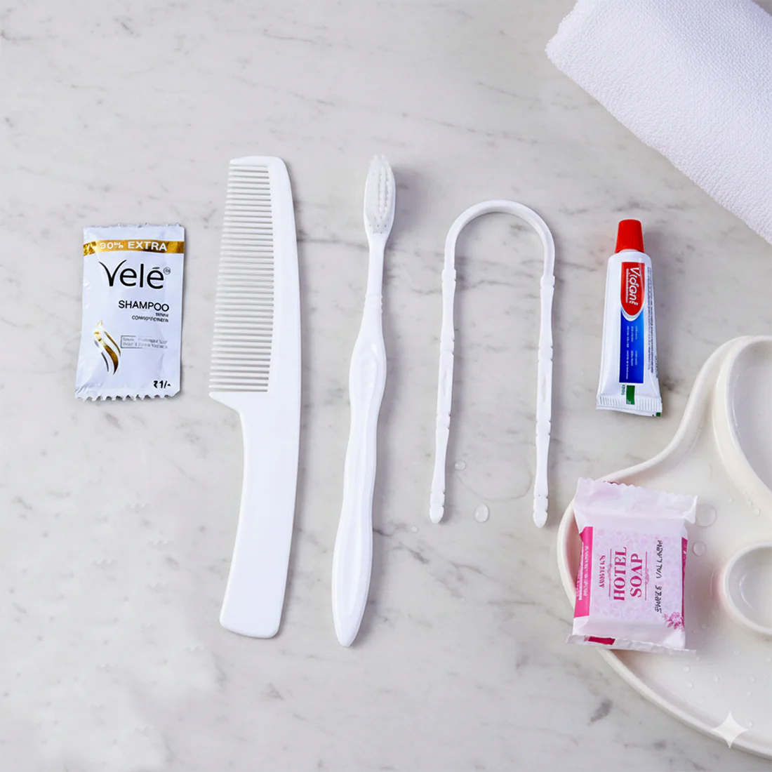 The Super Bath Pack is a complete, ready-to-use personal hygiene kit thoughtfully curated to cover all basic bathing and oral care needs in one convenient pack. It includes a comfortable toothbrush, refreshing toothpaste, gentle hotel-grade bathing soap, a nourishing shampoo sachet with conditioner, a practical tongue cleaner for better oral hygiene and a comb for everyday grooming. Each item is neatly packed to maintain hygiene, making it perfect for hotels, lodges, hostels, guest houses and travel use. Compact and easy to distribute, this kit ensures guests and travellers always have clean, fresh and reliable essentials wherever they stay.