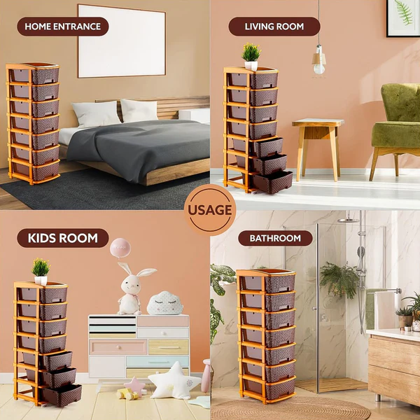 Declutter your space in style with this 7-Layer Multipurpose Plastic Storage Drawer Unit, featuring a sleek woven-style texture and durable plastic construction. Designed to provide smart vertical storage, this drawer organizer is ideal for organizing clothes, toys, office supplies, accessories, and more. Its rich brown drawer faces with translucent panels and vibrant frame create a modern look that blends seamlessly into any room. Each drawer glides smoothly, offering easy access while keeping your belongings dust-free and organized. This is your go-to solution for efficient and elegant home storage.