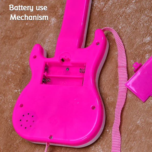 - Electronic Musical Mini Guitar Toy Is A Lightweight Toy, Easy To Hold, With Nice Appearance, 3D Lights Blink While Playing | It Is A Battery Operated Toy Which Uses 3×1.5v “AA” Size Batteries ( Batteries Not Included In The Box ).