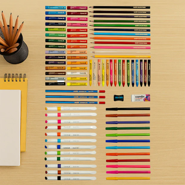 Includes: Crayons, Oil Pastels, Color Pencils, Brush Pens, Sketch Pens, Eraser, Sharpener, Drawing Pencils, Ruler & More.