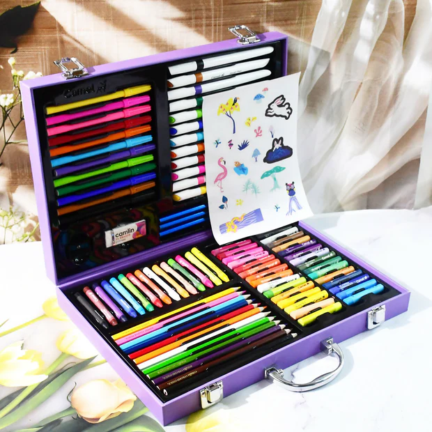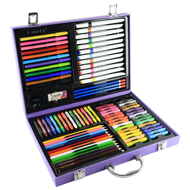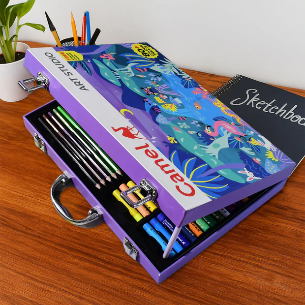 Unleash your creativity with the Camel Art Studio Kit (80+ pieces) – a premium all-in-one art set designed for kids, students, and budding artists. Neatly packed in a stylish purple carry case, this set includes a wide variety of drawing and coloring tools such as sketch pens, crayons, oil pastels, colored pencils, brush pens, and essential stationery.