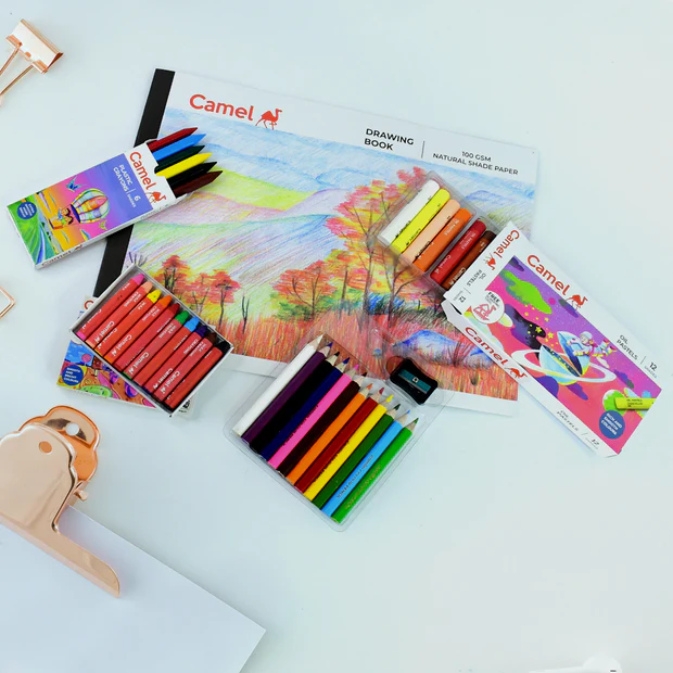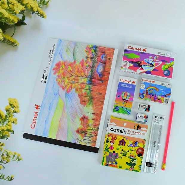 The Camel Drawing Kit is the perfect companion for kids and beginners stepping into the colorful world of art. Thoughtfully curated, this kit includes everything a child needs to sketch, color, and express their imagination. With a mix of vibrant oil pastels, crayons, and colour pencils, along with essential stationery like a drawing book, scale, sharpener, and eraser, this kit makes learning art both fun and engaging. Packed in a bright and attractive pouch, it is an ideal choice for school projects, homework, or simply letting creativity flow at home.