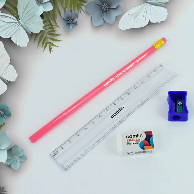 Includes essential stationery like scale, pencil, sharpener, and eraser.