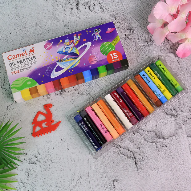 Camel Oil Pastels are specially crafted to provide smooth, vibrant, and long-lasting colours for artistic creations. With 15 assorted shades, these pastels deliver rich pigmentation and easy blending, allowing artists and students to create striking effects. The soft texture ensures effortless application on paper and board, while the included free scraping tool helps explore advanced techniques like scraffito and layering. These oil pastels are non-toxic and safe for children, making them a trusted choice for both beginners and professionals.