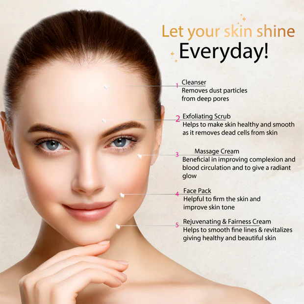 Includes cleanser, exfoliating scrub, massage cream, face pack, and rejuvenating cream