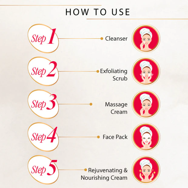 Includes: Cleanser, Exfoliating Scrub, Massage Cream, Face Pack, Rejuvenating Cream