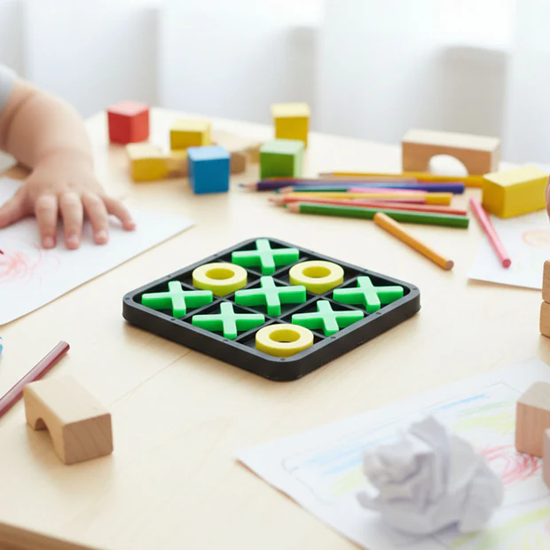 This classic tic tac toe board game set is designed to provide fun, learning, and interactive play for children and families. The game features a sturdy grid board with easy-to-handle interlocking X and O pieces that stay securely in place during play. It helps develop logical thinking, turn-taking skills, and hand-eye coordination while keeping kids engaged away from screens. The compact design makes it suitable for tabletop play at home, school, or during travel. A timeless game that encourages learning through play and shared family moments.