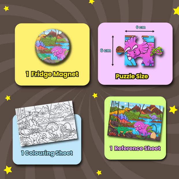 - Collectible Fridge Magnet: Once complete, proudly display your dino masterpiece on the fridge with this cool magnet.