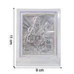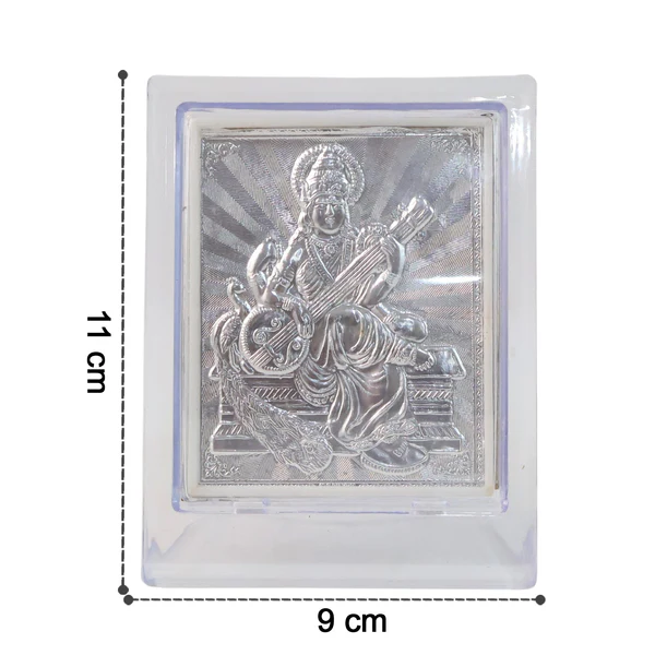 This premium-quality silver photo frame features an intricately embossed image of Goddess Saraswati, the Hindu deity of wisdom, learning, and the arts. Crafted with fine detailing, the frame beautifully captures the serene posture of Saraswati Maa holding her veena, symbolizing knowledge and creativity. Encased in a transparent protective acrylic cover, the silver panel remains untarnished and retains its shine for years. The frame comes with a sturdy stand for easy tabletop display, making it an ideal decorative piece for pooja rooms, study areas, and gifting on auspicious occasions.