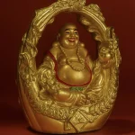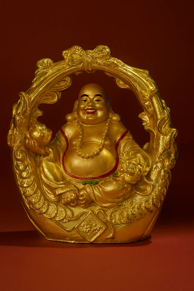 Golden Laughing Buddha Idol in Ornate Arch Frame | Lucky Buddha Statue