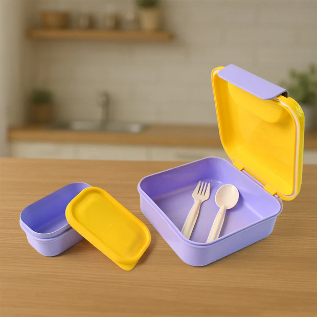 Make mealtime more fun and functional with this colorful and compact Lunch Box Set designed especially for kids and daily commuters. This set includes a large square lunch box with a matching spoon and fork, and a smaller inner container with a lid—ideal for separating snacks or curries. Made from food-grade plastic, it is lightweight, easy to carry, and safe for everyday use. The bright, dual-tone design adds a vibrant touch, while the firm locking mechanism ensures mess-free portability.