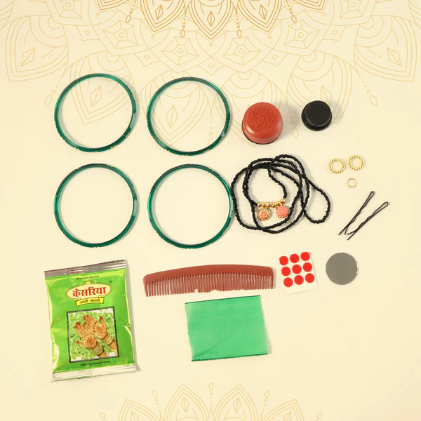 Bindi, Chunri, Mangalsutra, Earrings, Nose Ring, Bangles, Kajal, Kumkum, Comb, Hair Pins, Ribbon, Mirror,Mehndi, Mataji, Photo