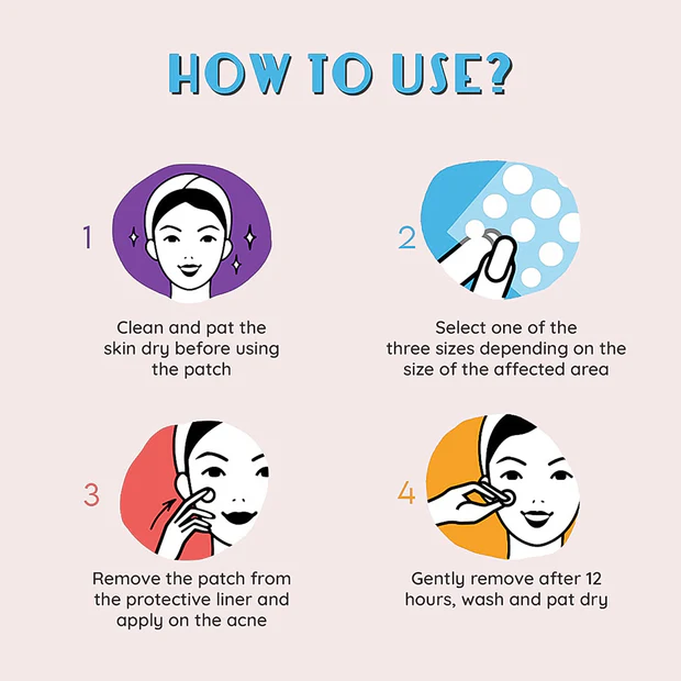 - Quick & Easy to Use – Using our acne patches is very easy. Simply clean and dry your pimple area, choose the right sized acne patch, carefully peel and stick the pimple patch on top of your pimple.