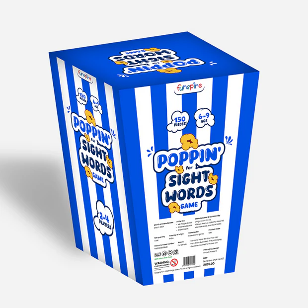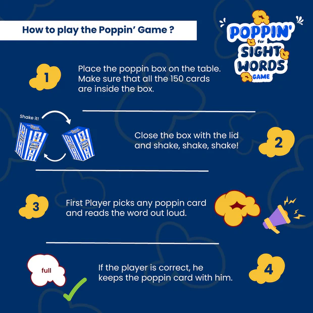 - Includes 150 popcorn-shaped cards: 142 sight words + 8 “POP!” cards that send your stash back to the box