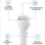 - Double gear speed regulation: freely choose different grinding intensity according to different frequency and speed. One-key switch dual gear speed regulation, strong power, solve the user’s different skin types and dead skin problems.