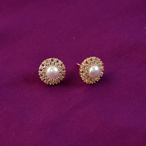 Round Pearl Stud Earrings with Crystal Border and Gold Finish for Women