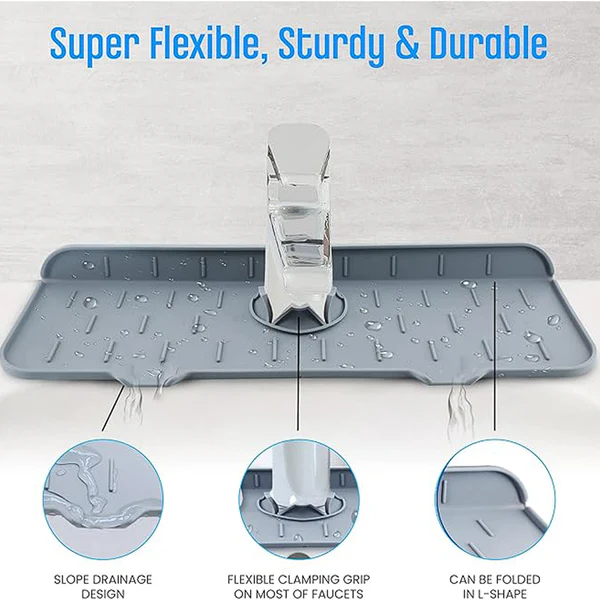 - A sink water splash guard mat specially designed for faucets, the silicone sink faucet splash guard is a labor-saving way to upgrade your kitchen sink. Our silicone faucet splash guard has a raised lip to drain water to the sink. Keep the countertop clean and dry.