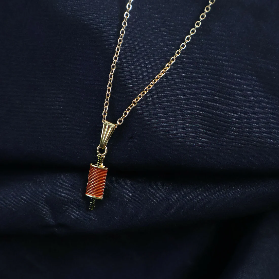 This stylish firki shape pendant necklace features a unique spinning-top inspired design that adds a playful yet elegant touch to your jewelry collection. The finely detailed cylindrical pendant with textured accents gives it a modern and distinctive look. Paired with a sleek chain, this necklace is perfect for everyday wear and casual outings while also complementing festive and fusion styles. Its minimal yet eye-catching design makes it a versatile accessory that stands out effortlessly.